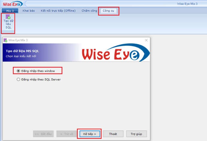 Mở phần mềm lên => Vào (1) khai báo => (2) chọn dữ liệu => (3) chọn kiểu dữ liệu SQL Window => (4) bấm kết nối và thoát